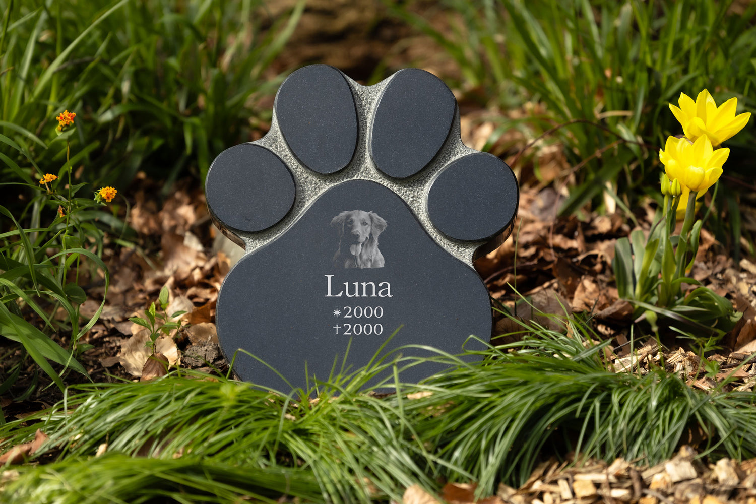 Unsere Gedenktafeln bieten genug Platz für eine individuelle Personalisierung. Mit einer dezent ausgearbeiteten Pfote wirkt sie hochwertig und gleichermaßen elegant.